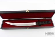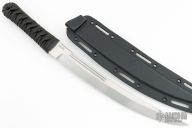 The Hisshou from CRKT features an upswept two tone blade with polished flats and hand rub satin grinds. The handle is comprised of Japanese style wrap over black leather and hidden tang construction. Includes kydex sheath and original box. Has a couple light scratches, otherwise excellent condition.