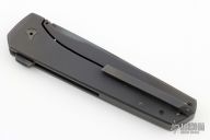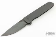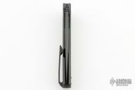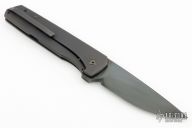 This Linerlock Flipper by JD VanDeventer features a blued, hand rub satin finished blade with notched flipper. The handle has darkened titanium scales, a carbon fiber backspacer, and matching tip up clip. Comes with Velcro case. Has a couple light scuffs and scratches, excellent condition.