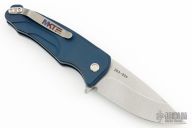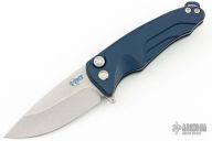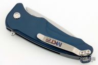 This Smooth Criminal by Medford knives features a stonewashed drop point blade with flipper. The handle has a blue aluminum frame with a titanium clip. Nice lockup and blade seating. Comes with the original box, zippered case and papers June 13, 2022.  Excellent Condition.