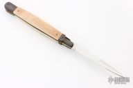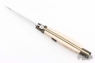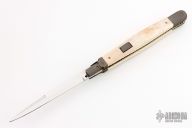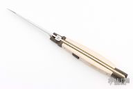 This Picklock from Lee C. Reynolds features a mirror polished blade with false top edge. The handle has Damascus bolsters, button and pommel with mammoth ivory scales over fileworked brass liners and stainless steel backspacer. Has a couple light scuffs, otherwise excellent condition.