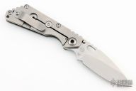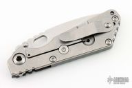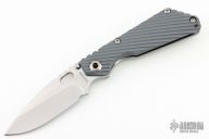 This SNG framelock folder features a stonewashed drop point blade with thumbhole and notched thumbrest. The handle has a grey G-10 and a stonewashed titanium frame with titanium clip, tip up carry. Jimping on blade spine. The G-10 has a diagonal groove pattern. Nice lockup, detent, and blade seating. Excellent condition.