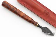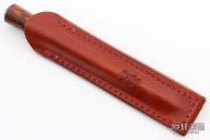 The Attention Getter by Neal Green features a black double edged blade with .683" blade depth, hidden tang construction. The handle has a round tapered grip. Comes with a brown leather sheath with red stitching. Excellent condition.