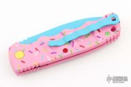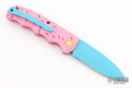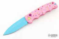 Have you ever been unfortunate enough to have to share a donut? Your plight only gets worse when you find you have to cover your high-speed, low-drag, modified, custom, mirror-edged piece of pocket jewelry in sticky sweetness. What you need is a knife designed from the ground up to go to war with a donut. And although its path to existence was unorthodox, the Dessert Warrior is here! This automatic will snap open before anyone can take more than their half of the donut. The handle is bright pink with sprinkles, and the blade has a candy blue finish, making the knife blend in with the pretty pastries of the shop. Gone are the days of not having the right tool for the job!