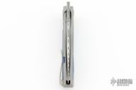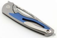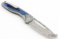 This Apex Flipper from Brian Nadeau features a Damasteel blade with a thumbhole, flipper and notched thumbrest. The handle is comprised of a grey titanium frame with blue aluminum inlays, satin titanium tip up clip. Rides on bearings, nice detent, lockup and blade seating, stainless lockface insert. Comes with original box and papers. Has a couple light scuffs, otherwise excellent condition.
