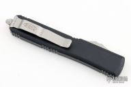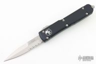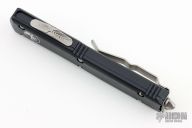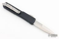 This Ultratech OTF automatic features a bayonet grind satin double edge blade with a partially serrated edge and a black anodized aluminum handle. Stainless steel clip. Glass breaker. Serial number 169115 and dated 06/2020. Comes with original box and papers. Has a couple of light scuffs, otherwise excellent condition.