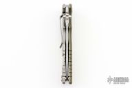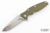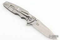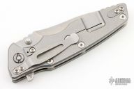 This Eklipse by Rick Hinderer features a stonewash finished blade with notched thumbrest and flipper. The handle has a stonewashed titanium frame, OD Green G-10 scale, satin hardware, and a tip up or down reversible stonewashed and anodized titanium clip and filler tab, lanyard hole at the butt. Excellent condition. Comes with original box and extra pivot hardware.