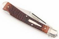 This knife features a satin finished blade with a single nail nick. The handle has nickel silver bolsters, fo jigged bone scales, brass liners and a stainless steel backspring. Includes the original box and papers. Excellent Condition.