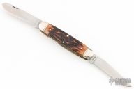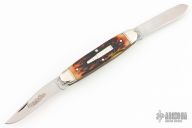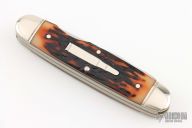 This Knife by Remmington has two satin finished blades with nail nicks. The handle has nickel silver bolsters, faux stag covers, brass liners and steel springs. Comes with original box and papers. Excellent condition.