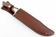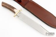 This Limited Edition Utility Bowie by Gerber features a satin finished blade with sharpened top edge, .303" blade stock and 1.465" blade depth, hidden tang construction. The handle has a brass guard and stag grip. Comes with a brown leather sheath, original box and papers. Excellent condition.