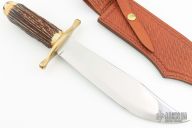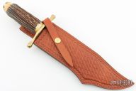 This Bowie from Case Knives fearues a mirror polished blade with false top edge. The handle is comprised of brass double guard and pommel with stag handle over hidden tang construction. Comes with a hand tooled brown leather sheath and original box and papers. Excellent condition.