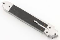 This Auto by Agasi Hambartsumian of Armenian Doctor Knives features a mirror polished blade with false top edge. The handle has stainless steel bolsters and liners, buffalo horn scales with brass pins, fileworked stainless steel backspacer. New from maker. Comes with a hand tooled brown leather sheath.