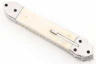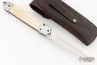 This Auto by Agasi Hambartsumian of Armenian Doctor Knives features a mirror polished blade with false top edge. The handle has stainless steel bolsters and liners, bone scales with brass pins, fileworked stainless steel backspacer. New from maker. Comes with a hand tooled brown leather sheath.