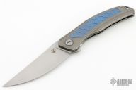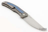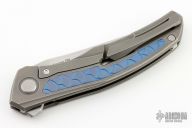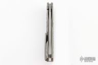 This Quantum Ursus by Shirogorov features a tumble finish blade with notched thumbrest and flipper. The handle has a blasted and milled titanium frame, Dragon inlays, backspacer, tip up titanium clip with hidden screws. Rides on SRBS, nice detent, lockup and blade seating. Cromax PM blade steel. Excellent condition.