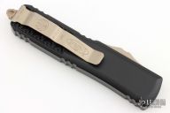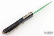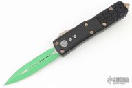 This UTX-85 OTF Automatic from Microtech features a green cerakoted double-edged blade with fuller. The handle has a black aluminum tri grip frame with bronzed steel thumb slide, clip and glass breaker. Dated 07/2022 with a S/N of 5926. Excellent condition. Comes with original box.