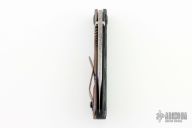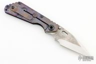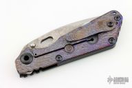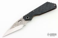 This Mick Strider SNG framelock folder features a wharncliffe blade with thumbhole and notched thumbrest, magma finished flats. The handle has a black G-10 and magma finished titanium frame with titanium clip, tip up carry. Jimping on blade spine. The G-10 has a cross-hatch pattern. Nice lockup, detent, and blade seating. It comes with a zippered case. Excellent condition.