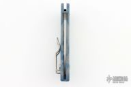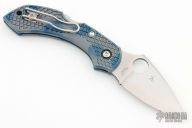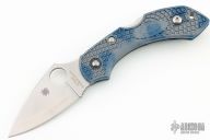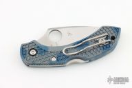 This Dragonfly II by Spyderco features a satin finished Super Blue core San Mai blade with thumbhole and notched thumbrest. The handle has blue/gray Zome scales, stainless steel backspacer, and a tip up clip, left or right reversible. Comes with original box and papers. Excellent condition.
