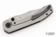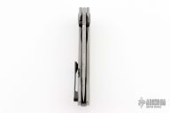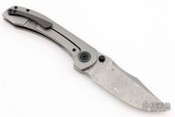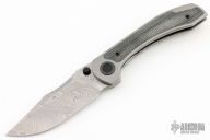 This Raptor by Brian Brown features a Damasteel blade with dual thumbstuds and notched thumbrest. The handle has a bead blasted titanium frame with a black canvas micarta inlay, zirconium pivot collars, tip up clip and backspacer. Comes with a zippered case and box. Excellent condition.