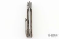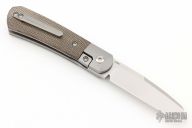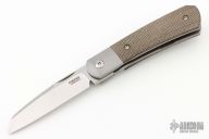 This Apache Front Flipper by Enrique Pena features a satin finished blade with a front flipper and notched thumbrest. The handle has titanium bolsters, green micarta scales with a titanium backspacer and matching tip up pocket clip. Includes a Pena X-Series padded box (wrong box: says "damasteel"). Has a couple light scuffs, excellent condition otherwise.