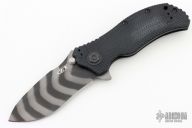 This 0303 frame-lock assisted flipper by Zero Tolerance features a recurve spear-point blade with a tiger stripe finish, stainless steel liner black G10 scale, and titanium scale with a black G-10 backspacer. Has custom skull anodizing, custom tip up titanium clip with bronzed screws. It also features the Speed-safe assisted opening system. Black stainless steel clip and lock bar stabilizer. Clip is 4-way reversible. Has a few light scuffs, otherwise excellent condition.