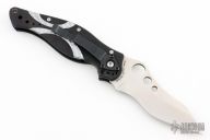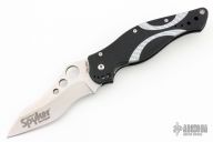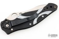 This Spyker liner lock folder is a collaboration between Spyderco and Kershaw, it has a satin finished recurve blade with thumbhole and notched thumbrest. Handle is black G10 with silver twill inlays and a black tip down clip.  Includes Spyderco zippered case and COA. This knife is one of 3000.  Excellent Condition.