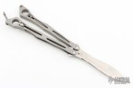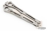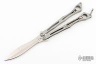 This Spyderfly Balisong by Spyderco features a satin finished spear point blade with a false top edge. The handles are bead blasted stainless steel with a tip up clip (4-way reversible). Has a couple very light scuffs, otherwise excellent condition.