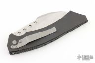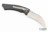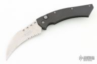 This Hawk Auto from Microtech has a stonewashed hawkbill partially serrated blade. Handle is black anodized aluminum with bead blasted titanium tip down clip. Action is quick and strong. S/N 0294. Dated 05/2002. Comes with original box, papers and sheath. Has a few scuffs, otherwise excellent condition.