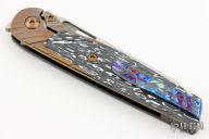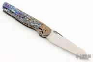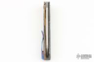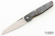 This Cortex by Brown Knives features a stonewashed polished clip point blade with notched thumbrest and flipper. The handle has a milled Zirconium front scale, with integral bolsters, inlaid carbon fiber scales, Zirconium backspacer, titanium frame with lock face insert, and over travel stop. Mokuti pivot collars and tip up clip with hidden screws. Rides on bearings, nice detent, lockup and blade seating. Comes with original box and COA #340. Excellent condition.