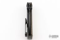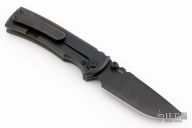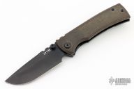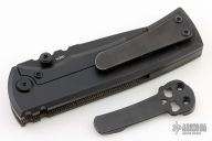 This Chaves Ultramar Redencion drop point features a black finished blade with the Chaves logo, dual thumbstuds, and notched thumbrest. The handle is made up of green canvas micarta and black titanium, skull pocket clip (positioned for tip up carry), and a matching titanium backspacer. Has overtravel stop. Blade is centered when closed, and locks up with no play. Comes with box and additional clip. Has some light scuffs and scratches, otherwise great condition.