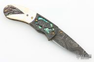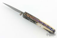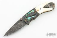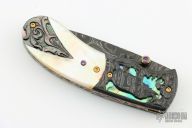 This knife by Suchat Jangtanong features a Damascus drop point blade with a single jewel inlaid thumbstud. The handle has carved Damascus bolsters, carved pearl scales, fileworked and anodized titanium liners, fileworked steel lockback, carved and anodized titanium backspacer, gold plated screws.  Carved black lip pearl rear bolsters. Comes with zippered case. Excellent condition.
