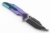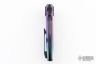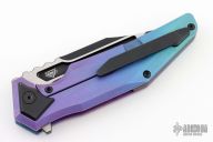 This Abyss by Arcane Design features a two-tone finished blade with notched thumbrest and flipper. The handle has an anodized titanium frame with black titanium pivot collars and tip up clip with hidden screws. Comes with original zippered case, COA dated 5/1/22, and extra bearings and pivot collars. Has a few light scuffs, otherwise excellent condition.