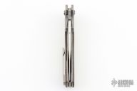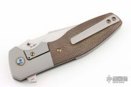 This Kirby Lambert Augustus by Reate Knives features a satin finished blade with notched thumbrest and flipper. The handle has a bead blasted titanium frame, green canvas micarta scales, anodized titanium pivot collars and screws, blasted titanium backspacer and tip up clip. Comes with original box and zippered case. Has a couple very light scuffs, otherwise excellent condition.