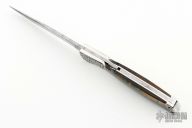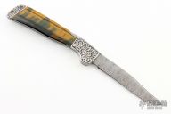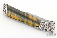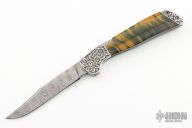 This lockback folder by Norman Levine features a Damascus clip point blade. The handle has dovetailed and engraved stainless steel bolsters and tiger's eye stone scales.  Bruce Shaw enhraving. Comes with a padded zippered case.  Excellent Condition.