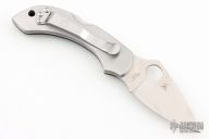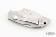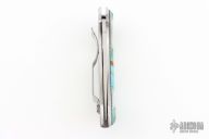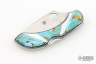 This Dragonfly by Spyderco has been customized by Santa Fe Stoneworks features a satin finished blade with thumbhole. The handle has a stainless steel frame with Kingman Turquoise and mother of pearl overlay. Comes with original box and papers. Excellent condition.