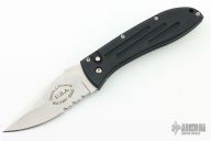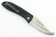 This Military Auto by Smith & Wesson is from the First Production Run. It features a satin finished partially serrated blade with notched thumbrest. The handle has a black aluminum frame with tip up black stainless steel clip, lanyard hole. Comes with original box. Has some scuffs, otherwise excellent condition.