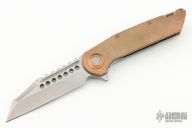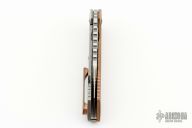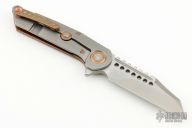 This Warhound flipper by Marfione Custom Knives features a wharncliffe shaped, M390 blade with fullers and flipper, blade has a two-tone DLC finish. The handle has an Eggshell finish copper scale with a DLC Apocalyptic finished titanium frame with matching tip up clip, titanium backspacer with lanyard hole, copper hardware, stainless steel lockface insert and overtravel stop screw with copper collars. Rides on bearings, nice detent, lockup and blade seating. Comes with original box, zippered case and certificate of authenticity signed/dated 10/2018. Has some patina, excellent condition otherwise.