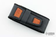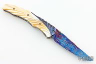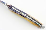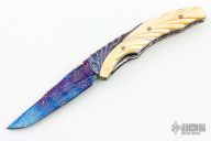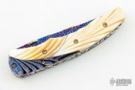 This knife features a blued Damascus blade with a knurled thumb disc. The handle has carved blued Damascus bolsters, carved gold lip pearl, fileworked titanium liners and a steel backspacer with abalone inlays. Includes a leather sheath.  Excellent Condition.