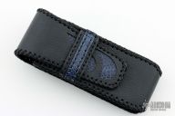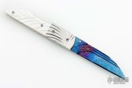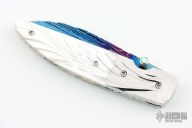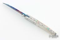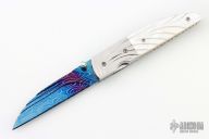 This knife by Appaloosa Knives features a blue Damascus blade with a single thumbstud with an abalone inlay, carved blade. The handle has carved steel bolsters, carved mother-of-pearl scales, fileworked titanium steel liners and backspacer with abalone inlays. Includes a leather sheath.  Excellent condition.