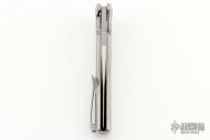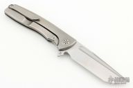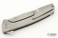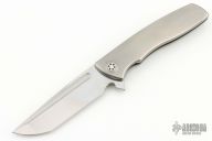 This Evo Typhoon Mid-tech from Brian Nadeau features a satin finished tanto style blade with a fuller and notched thumbrest. The handle is comprised of a bead blasted titanium frame, matching titanium tip up clip. Rides on bearings, nice detent, lockup and blade seating, stainless lockface insert. Includes original box. Has a couple light scuffs, otherwise excellent condition.