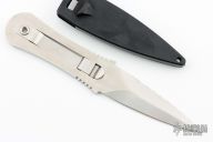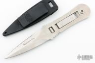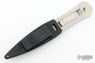 This boot knife by Gerber is a Blackie Collins design, it features a satin finished blade with one plain edge and one serrated edge, .162" blade stock and 1.075" blade depth, full tang construction. The handle has a clip that holds it in the sheath. Comes with black plastic sheath. Has a few light scratches, otherwise excellent condition.