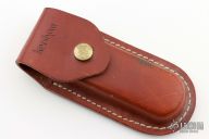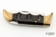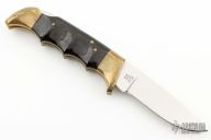 This Folding Field Model 1050 by Kershaw features a mirror polished drop point blade with notched thumbrest and nail nick, a custom thumb stud has been added. The handle has brass bolsters and liners, black scales. Has some patina, otherwise excellent condition. Comes with a brown leather sheath.