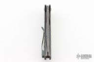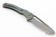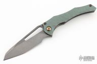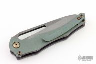 This Custom Spiney Dogfish by Gavko Knives features an acid wash and tumble finished blade with textured spine and a thumbhole. The handle has a tumbled and anodized titanium frame with matching tip up clip. Nice detent, lockup and blade seating. Excellent condition.