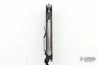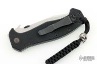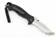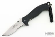 This CQC-15 by Emerson Knives has a stonewashed partially serrated tanto recurve blade with thumb disc and notched thumb rest. Handle is black G10 with titanium liners, black standoffs, lanyard hole and tip up black stainless steel clip. Nice detent, lockup and blade seating. Comes with original box and papers. S/N 3375. Excellent condition.