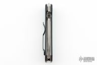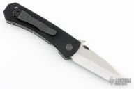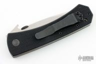 This knife has a stonewashed blade with thumbdisc and wave feature. The handle has textured black G-10 scales, titanium liners, and a tip up stainless steel clip. S/N 146. Excellent condition. Comes with original box and papers.