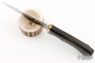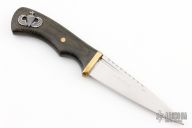This knife by Daniel Tokar features a satin finished blade with fullers and fileworked spine, .109" blade stock and .859" blade depth, hidden tang construction. The handle has a brass guard and a black canvas micarta grip, brass pin. The knife is stamped "SGH-001". Excellent condition.