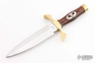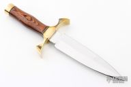 This Dagger by Gil Hibben features a mirror polished double edged blade with .244" blade stock and 1.502" blade depth, hidden tang construction. The handle has a brass guard and butt with a dymondwood grip and black/brass spacers. Excellent condition. Has "HK" engraved on the guard and Paratrooper wings inlaid in the handle. Made in late 70s, early 80s.