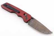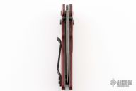 This Mark 3 by A2D Mercantile features an acid wash tumble finished blade with dual thumbstuds. The handle has a red micarta scales, anodized titanium liners, titanium tip up clip. Nice detent, lockup and blade seating. Comes with zipper case and COA. Excellent condition.