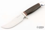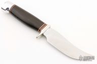 This Model 22 Outdoorsman by Randall Made Knives features a satin finished blade with notched thumbrest, .137" blade stock and 1.236" blade depth, hidden tang construction. The Model 22 is a thinly-beveled blade for the professional outdoorsman. The handle has a nickel silver guard, black linen micarta handle with red/white/blue spacers (7 spacers), duralumin butt. Has a couple light scratches, otherwise excellent condition.