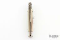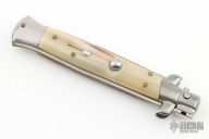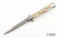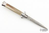 This Swivel Bolster auto features a Damascus bayonet ground blade. The handle has stainless steel bolsters, honey horn scales over brass liners and stainless steel backspacer. Has a few light scratches, otherwise excellent condition.