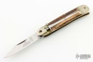 This Lever Lock Automatic by Hubertus Knives features a polished clip point blade with nail nick. The handle is comprised of nickel silver double bolster and lever with stag scales over brass liners and steel backspacer. Has some light scratches and patina, otherwise excellent condition.