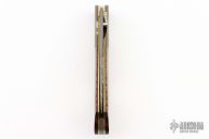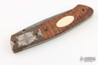 This custom liner lock folder by Bill Ankrom features a Damascus blade with single checkered thumb stud. The handle has mosaic Damascus bolsters, curly koa wood scales with 18k gold escutcheon, anodized titanium liners and a Damascus backspacer. Nice function, strong lock up and nice detent and blade seating. Includes a padded zippered case. Excellent Condition.